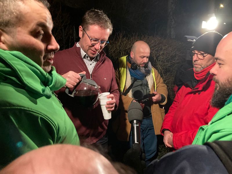 2. Incriminer les syndicats, les présenter comme responsables de la situation. Ce mardi matin, sur RTL, le ministre Desquesnes expliquait ainsi qu’il souhaite ardemment le dialogue social mais que les syndicats « irresponsables » (sic) pratiquent la politique de la chaise vide et qu’il en est vraiment désolé. C’est cependant complètement faux : j’ai pu confirmer auprès de plusieurs sources qu’un rendez-vous avait été fixé aux représentants du personnel le mercredi 28 janvier au cabinet du ministre, mais celui-ci était… absent. Les travailleurs ont réclamé qu’une nouvelle réunion se tienne rapidement, le we si besoin, mais la seule date qui leur a été donnée, c’est celle du jeudi 5 février, plus d’une semaine plus tard. Ce mercredi matin, 200 travailleurs se sont rendus au petit matin (photo) devant la jolie quatre-façade péri-urbaine du ministre, à Casteau, avec une table et des chaises, pour rappeler leur désir de négocier, mais le ministre n’a pas eu la correction de reconnaître qu’il avait raconté n’importe quoi sur RTL.