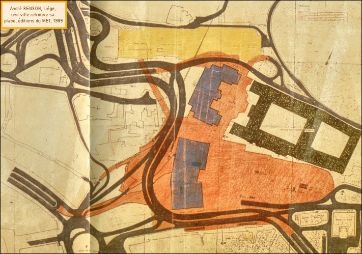3. Liège n’a plus de transport public digne de ce nom. Le démantèlement du réseau de tram dans les années ’60 puis la contraction du service ferroviaire urbain (fermeture des lignes 31, 32 ou 38, et de tant de gares…) se sont accompagnées de la construction de voies rapides partout où c’était possible, notamment sur les rives de tous les cours d’eau. Liège a donc fait, de la façon la plus évidente, le choix du tout-à-la-voiture dans les années ’60 (illustration : projet d’aménagement de la place Saint-Lambert), une époque où l’argent public coulait à flots. La ville en a été profondément transformée et la manœuvre inverse demande des moyens qui sont devenus beaucoup plus rares. Quant au transport public, il a fallu attendre pas moins de 40 ans pour qu’un nouveau projet de transport soit décidé — une malheureuse ligne de tram —, qui a encore mis 16 ans de plus à arriver. On a littéralement pris des décennies de retard sur toutes les grandes villes européennes (et on continue à accumuler ce retard).