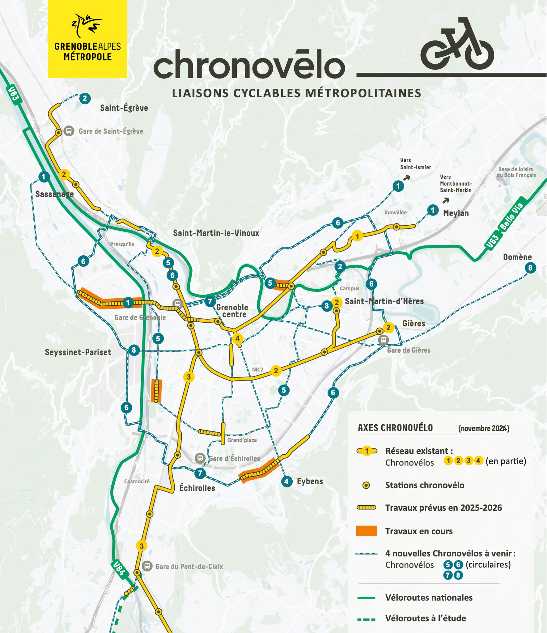 Je rentre ce lundi soir de quatre jours à Grenoble — où j’étais à l’invitation du réseau « En train » qui y tenait son forum annuel, j’en dirai sûrement un mot dans les prochains jours — puis à Lyon. Ça m’a donné l’occasion de tester de façon approfondie les réseaux cyclables structurants de ces deux métropoles — le Chronovélo et les Voies Lyonnaises.
