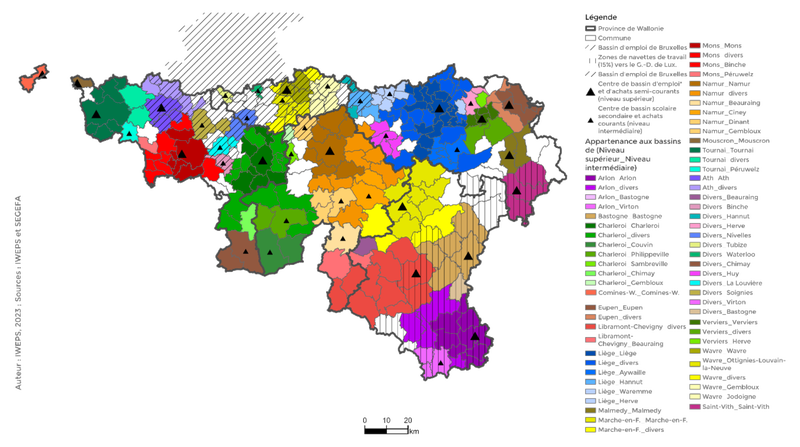 Illustration : Synthèse de structuration du territoire en bassins multiscalaires (bassins d’emploi intrawallons, sans prise en compte des flux sortants). IWEPS, Working paper n°40, janvier 2024.