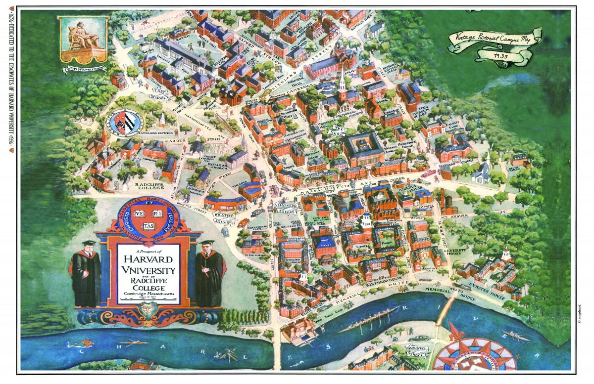PS : Bon, allez, en fouillant un peu dans les vieilles cartes, je suis tombé sur un dessin de 1935 — parfaitement syncro avec le passage de Marcel, donc — qui représente le campus de Harvard au milieu d’une forêt (alors qu’il se trouvait bel et bien au milieu d’un espace urbain !) : peut-être ce dessin a-t-il connu une prospérité transatlantique insoupçonnée de son auteur ? Qui sait…